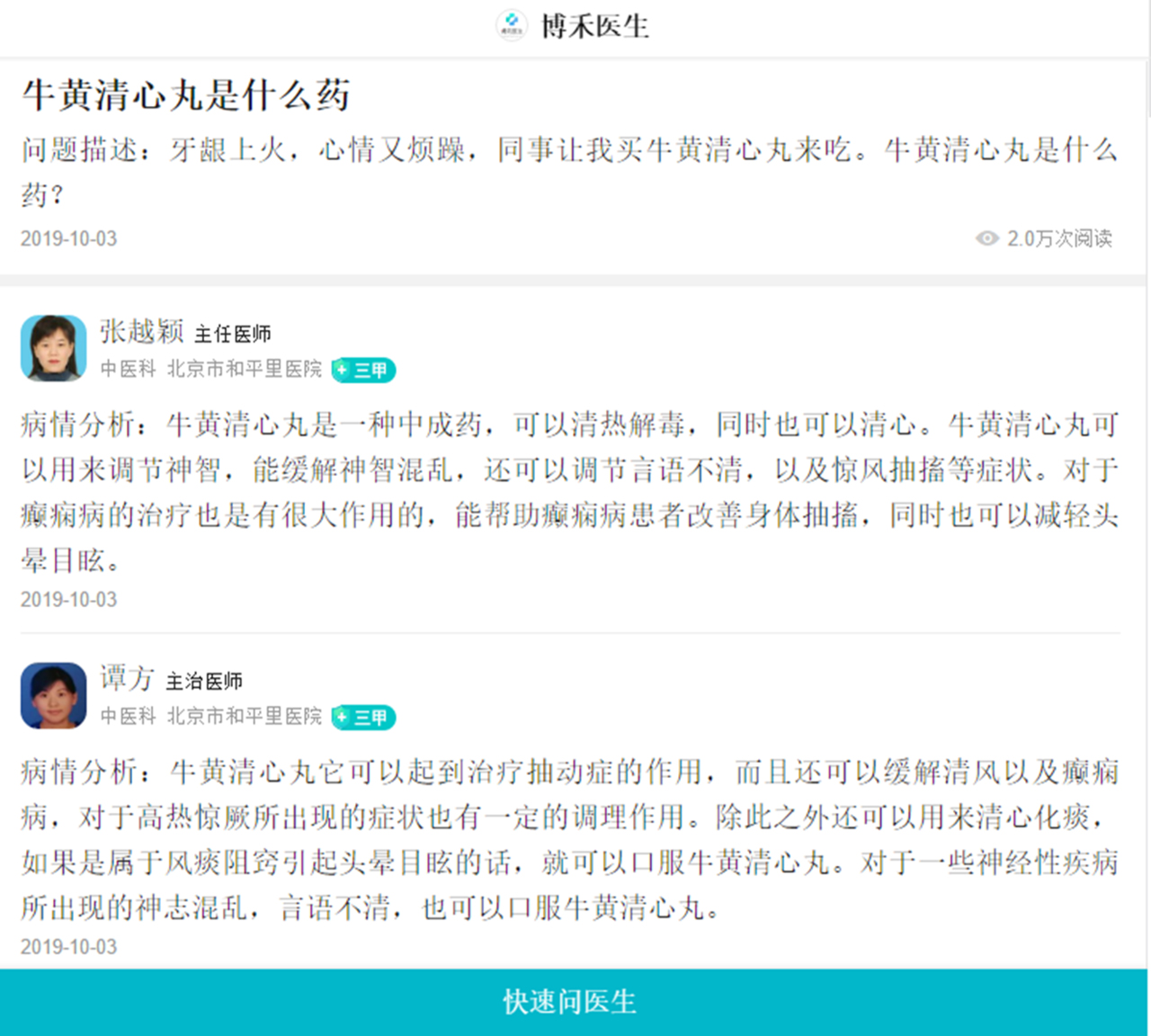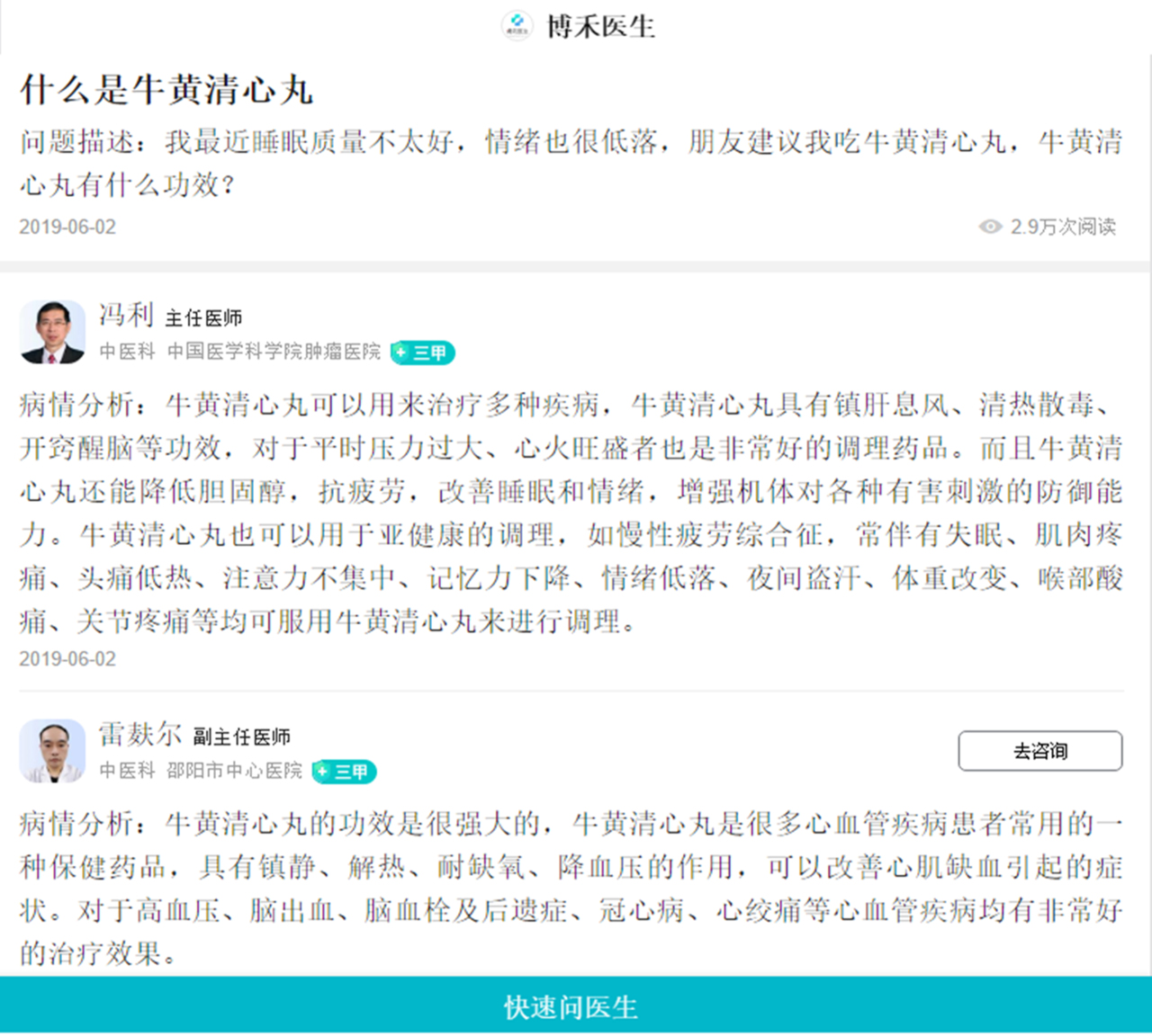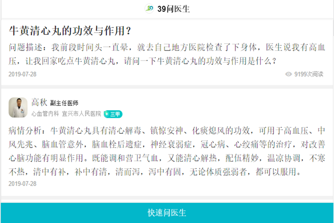 其實(shí)每一天在我們的醫(yī)療遠(yuǎn)程系統(tǒng)里面,全國(guó)都會(huì)有上千的人來(lái)咨詢牛黃清心丸。各位名醫(yī)大家遠(yuǎn)程去解答大家的問(wèn)題,為大家排憂解難,為我們的健康保駕護(hù)航。尤其是負(fù)責(zé)牛黃清心丸的解答。下面我們可以看到這些圖片,都是名醫(yī)專家在回復(fù)咨詢者在咨詢牛黃清心丸。