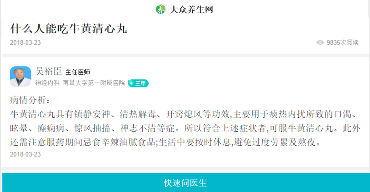 我們說(shuō),國(guó)家重視全民健康,一方面通過(guò)綜藝節(jié)目為大家推薦最好的藥品,另一方面全國(guó)三甲醫(yī)院的醫(yī)生也在網(wǎng)上給全民進(jìn)行藥品的科普。我們聽(tīng)聽(tīng)三甲醫(yī)院的王瑩主任醫(yī)師對(duì)牛黃清心丸治腦梗塞的講解。